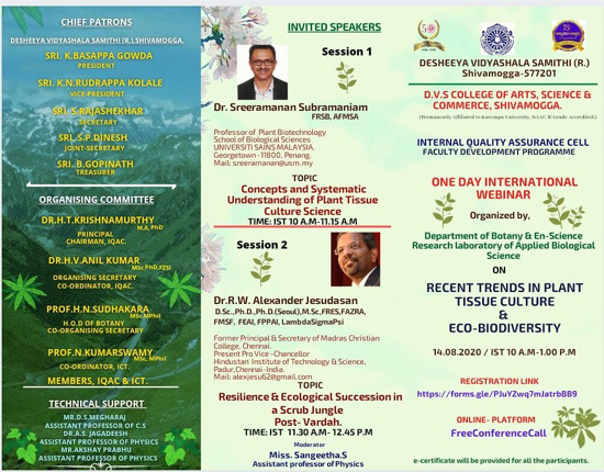 One Day International Webinar Recent Trends In Plant Tissue Culture & Eco – Biodiversity On 14-08-2020/ 1st 10.00 A.M – 1.00 P.M For Registration << Click Here
